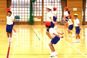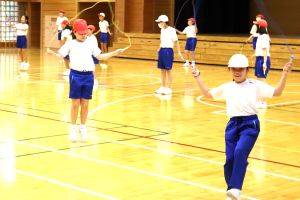 雨の日の業間運動に短縄跳びに取り組んでいます。30秒間隔で「跳ぶ」「休む」を繰り返し、いろいろな跳び方で自分の記録更新を目指しています。