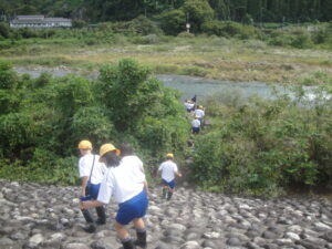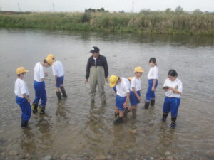5年生は、10月3日に理科「川の流れ」の校外学習に行きました。上流、中流、下流の河川敷に下りたり、浅瀬に入ったりして流れの速さや石の形・大きさ等を観察しました。実際に見ることで、教科書の説明や資料の意味の深い理解につながります。