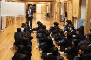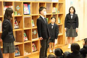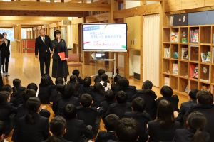 2学期の終業式を行い、代表児童や校長先生から2学期を振り返ったり冬休みや3学期の目当てを考えたりしました。