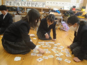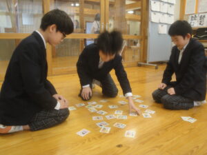 2学期最終日の今日は、復習、大掃除等を行いました。そして、少し、お正月気分を味わうためと、百人一首大会の前哨戦として、かるた大会を行いました。子供たちは「久しぶりだなあ」「懐かしい」などと話しつつ、「このことわざは、〇〇という意味だね」と、5年生らしい一面も見せながらかるたを取り合いました。礼儀正しく、また、白熱した大会で、2学期を締めくくりました。