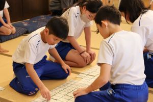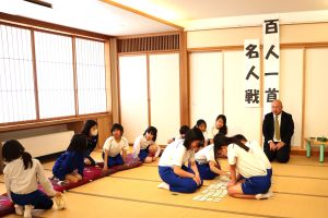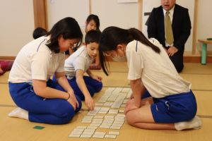 中・高学年百人一首大会の1・2位4人が対戦する百人一首名人戦を行いました。上の句を読み始めると、早いうちにとってしまう札が多く、テンポのよい対戦となりました。