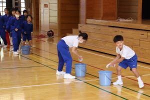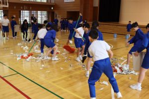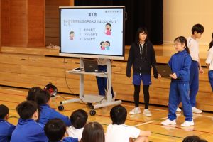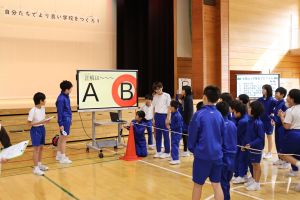 五箇山っ子集会を開きました。目当ては、「自分たちでより良い学校をつくろう」で、今日の集会では、正しい「清掃」「あいさつ」の仕方がテーマでした。ゲームやクイズで楽しみながら伝えられるように、委員会で工夫していました。