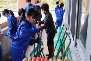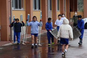 うっすらと雪が積もる寒い朝となりました。外遊びで使った竹馬や一輪車等を片付け、除雪道具等の準備をしました。